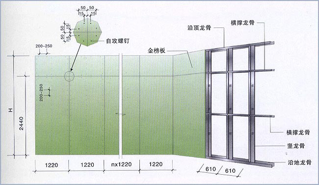 安裝方法 一、輕鋼龍骨骨架 1、放樣彈線 2、用射釘或膊脹螺絲將龍骨分別目定在地板與頂部樓板 3、將整龍骨按設(shè)計要求(一船612mm)排列好,井安裝好橫撐龍骨 二、板材封裝固定 1、先將材板切至所需尺寸(比墻高短10mm左右) 2、板材以錯縫的方式用自攻蜂絲固定在龍骨上,自攻螺絲間距一般為200-250mm左右,需沉入板面0.5mm 3、注意板與板之間需留4mm左右伸縮縫。 4、封板應(yīng)從板中向板四周固定,不可多點同時作業(yè),避免產(chǎn)生內(nèi)應(yīng)力而使板材扭曲 5、在板材封裝固定前,視需要可在龍骨骨架空腔內(nèi)部置入玻璃棉或巖棉等以加強隔音,防火效果。 墻體應(yīng)用設(shè)計指南 · 輕鋼龍骨墻體主要用于內(nèi)隔墻。當用于分戶墻、走道、樓梯間等對隔聲、防火、防水、防盜及耐久性要求較高的部位時,應(yīng)慎重選用板材品種和合理的墻體構(gòu)造。(請與我司技術(shù)支持部聯(lián)系) · 墻體連續(xù)長度不宜大于25m,超過時可設(shè)置伸縮縫。 · 墻體的適用高度與龍骨的品種,截面尺寸和間距有關(guān),請參照上述《常用輕鋼龍骨限制高度表》及說明。龍骨與建筑結(jié)構(gòu)應(yīng)連接牢固。龍骨的邊框與建筑結(jié)構(gòu)的連接可采用膨脹螺栓或射釘固定,間距不宜大于800mm。為加強墻體剛度而采用通貫龍骨時,其間距不宜大干1500mm。豎龍骨與橫龍骨連接采用直徑為4mm,長度為8mm的抽芯鉚釘,或用專用的龍骨鉗固定。 · 板用自攻螺絲固定在龍骨上。如無說明,自攻螺絲的規(guī)格一般為直徑3.5~4mm,長度25~35mm。 · 墻體與梁、板、墻、柱應(yīng)連接牢固,結(jié)合處應(yīng)緊密相連無縫隙,采用與板材相適應(yīng)的膩子或密封嵌縫粘結(jié)材料填實、刮平并貼防裂帶蓋縫。 · 對防火要求較高的墻體須采用防火性能較高的板材系列。 · 有防水要求時,應(yīng)選用防水性能較高的易和利保板,墻面做防水處理以加強產(chǎn)品的耐久性。在墻腳處應(yīng)設(shè)100mm高的細石混凝土墻墊,墻墊也應(yīng)作防水處理。 · 墻體面板可吊掛10kg以下的物件。吊件固定在龍骨上時可增加吊掛能力。如需吊掛重物時,需加密的排布及增加鋼(木)墊板或趕增加鋼(木)墊板或角鋼及連接構(gòu)件,將荷載傳遞到龍骨骨架上,防止面板受損。 | |